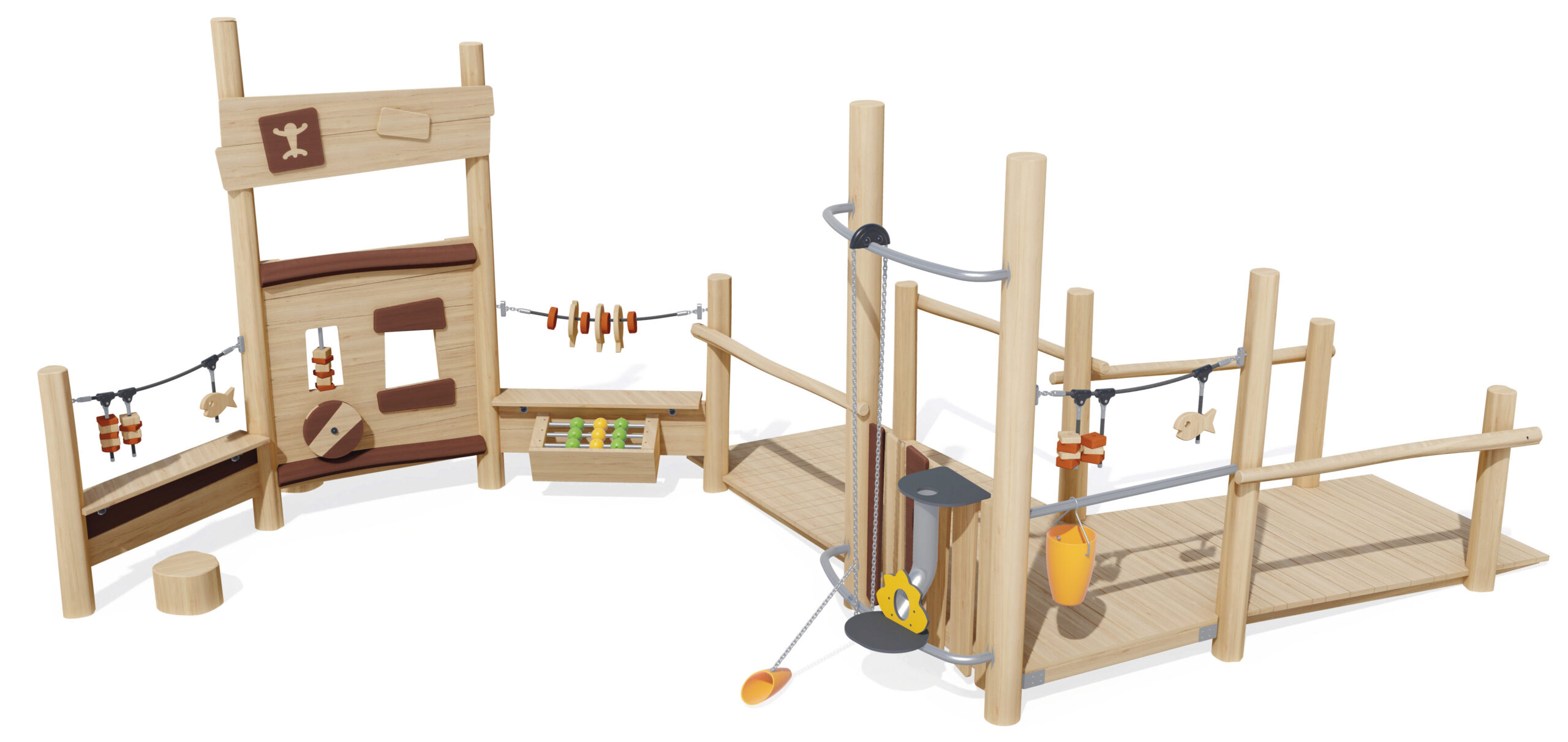 A gdyby tak na placu zabaw można zrobić zakupy? Zabawa w sklepik jest zwykle ekscytująca dla wszystkich dzieci. Dzięki łagodnym podjazdom i otwartej konstrukcji dzieci mogą swobodnie wjechać na platformy również wózkiem inwalidzkim, bez żadnych barier. Dzieci mogą wcielać się w role sprzedawcy i klienta, odgrywać scenki z codziennego życia, uczyć się komunikacji i współpracy. Do dyspozycji dzieci znajdują się okienko, lady, wiszące produkty spożywcze, które można przesuwać, liczydło które pomoże dobrze obliczyć wartość zamówienia, a także elementy do zabawy piaskiem. Dziecięca fantazja nie zna granic, dzieci same zadecydują, czy stragan na ryneczku będzie sklepem spożywczym, rybnym, czy może nawet lodziarnią.