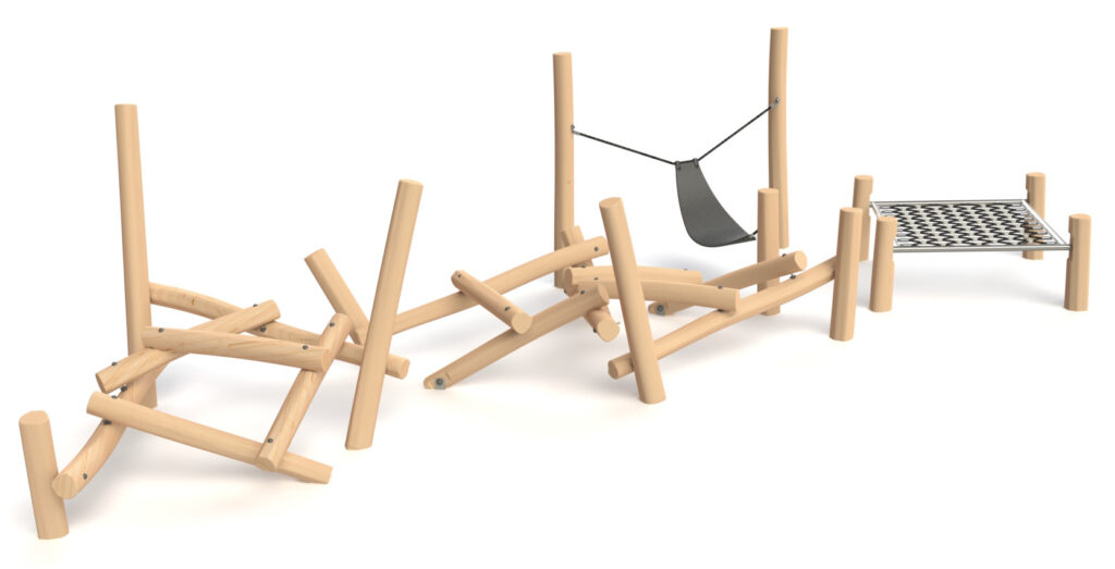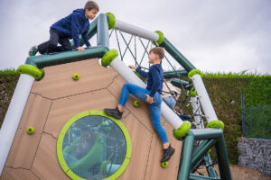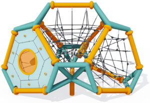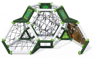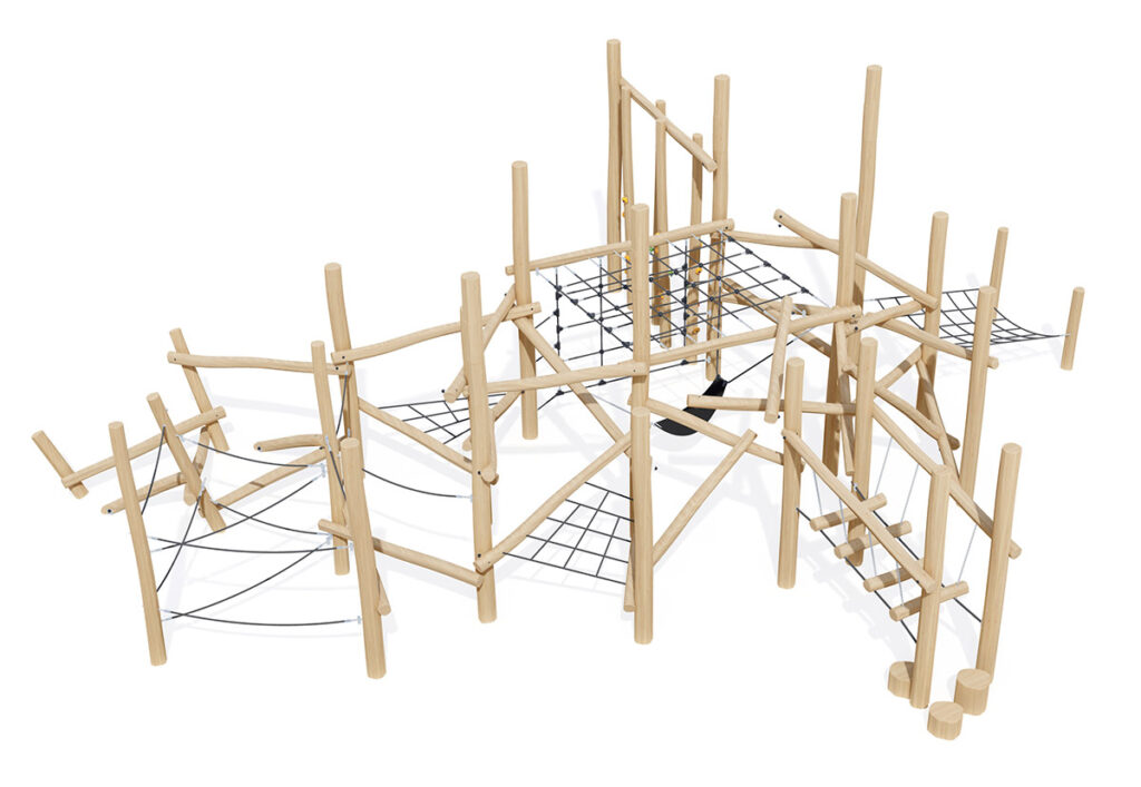 Ich forma znacząco odbiega od tradycyjnych zestawów zabawowych – zamiast wież, zjeżdżalni czy klasycznych domków dominują tu geometryczne bryły, sieci linowe oraz otwarte, wielokierunkowe układy przejść. Wspinaczka po linach i elementach konstrukcyjnych angażuje całe ciało, rozwijając siłę mięśni, koordynację ruchową oraz równowagę. Jednocześnie przestrzenny charakter konstrukcji wymaga planowania ruchu i orientacji w przestrzeni, co wspiera rozwój poznawczy. Ważnym aspektem jest także element wyzwania – pokonywanie wysokości i bardziej wymagających tras sprzyja budowaniu pewności siebie i samodzielności.