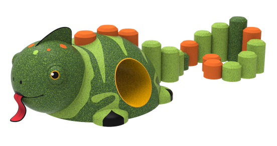 Kameleon z tunelem to wyjątkowy, gumowy element placu zabaw, który łączy funkcję zabawową z atrakcyjnym designem inspirowanym naturą. Centralnym elementem jest tunel przechodzący przez korpus kameleona, który umożliwia dzieciom czołganie się, przechodzenie i kreatywną zabawę. Gumowe palisady o zróżnicowanej wysokości i kolorystyce, ułożone